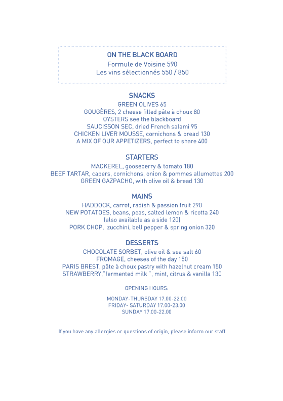 Voisine offers a thoughtfully curated menu that blends the essence of classic French dining with a relaxed, neighborhood atmosphere. The menu features a range of simple yet carefully prepared dishes, ideal for sharing and enjoying alongside their extensive wine selection.